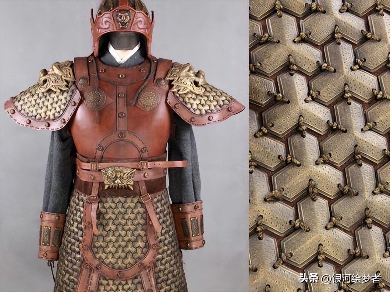 甲片在编缀时都是上片压下片,这是受力的问题。使得铠甲既坚固耐用,又灵活轻便。
