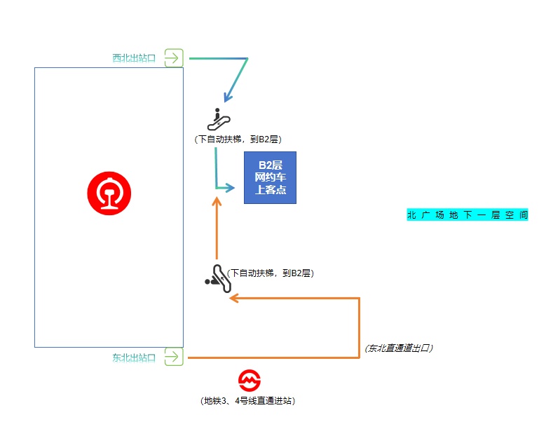 从上海站西北、东北出口出站以后,根据现场指示标牌,乘坐扶梯或者直达电梯,可以到达北广场B2地下停车区域。
