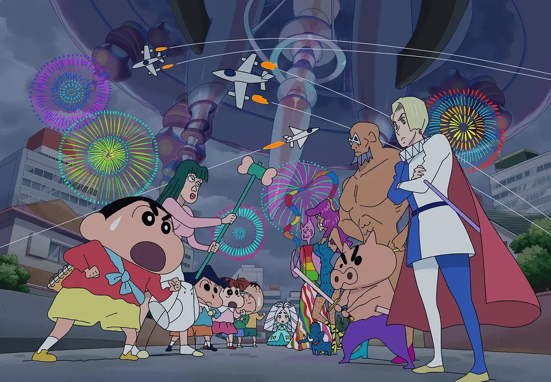 在《蜡笔小新:激战!涂鸦王国和约四位勇士》里,悬浮在空中的涂鸦王国为了守护自己的国家,对地面的人类发动攻击,强迫小孩进行涂鸦。