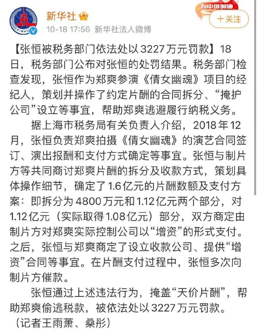 10月18日,张恒被税务部门依法处以3227万元罚款。