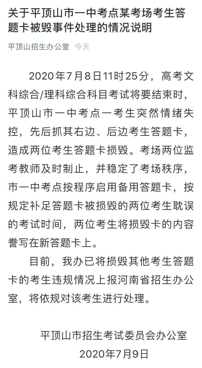 据官方说明显示,7月8日11时25分,高考文科综合/理科综合科目考试将要结束时,平顶山市一中考点一考生突然情绪失控,先后抓其右边、后边考生答题卡,造成两位考生答题卡损毁。