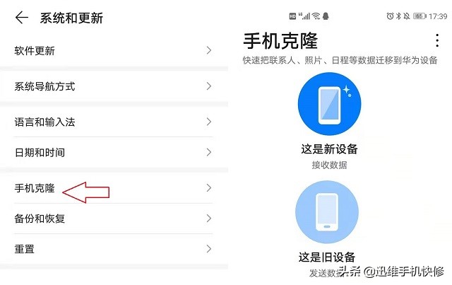 点击设置——系统和更新——手机克隆,点击旧设备就会出现扫描,点击新设备-华为就可以出现一个二维码,用旧手机扫码新手机的二维码,手机就会自动进行数据备份了,这个操作非常方便。