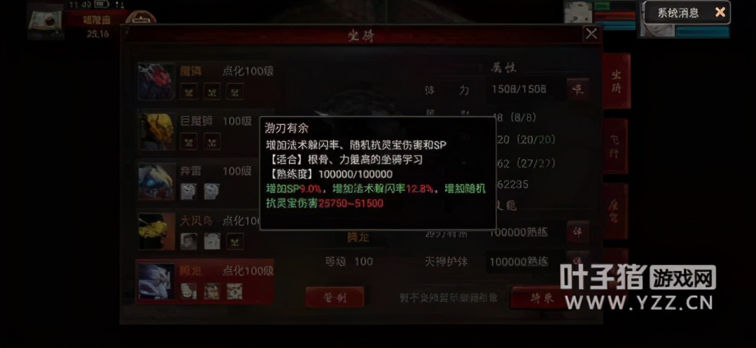 5、坐骑选择走特例。大家都知道狐小妖都是血定加点,定力加点340-550不等,这个不仅给狐小妖带来了伤害减免,也带来了不菲的法术躲闪,如果搭配人/鬼7坐骑的游刃有余(额外增加12.8%法术躲闪,25750-51500抗灵宝伤害),可以大大增加生存几率。