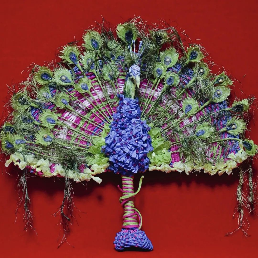 以绳编作品为基础,进行表层的装饰,可发挥的空间就更大了。一把孔雀扇就是在绳编作品上,加上一些绿丝线、亮片、串珠等,做成孔雀的造型,看上去实用又好看。