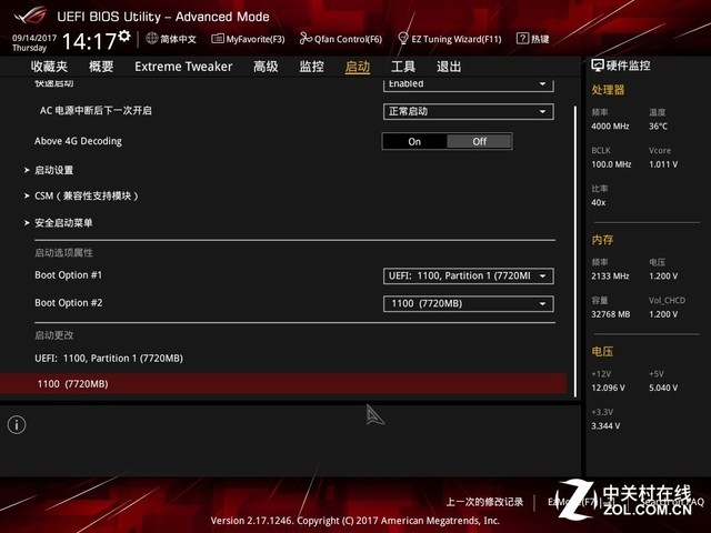 在启动选项属性一栏中我们可以看到我插入的一个U盘(名字为1100),因为这台机器没有插硬盘所以只能识别到U盘,前面带有“UEFI:”前缀的表示用UEFI方式来引导这个设备启动,下面的没有前缀的代表用Legacy方式来引导这个设备。