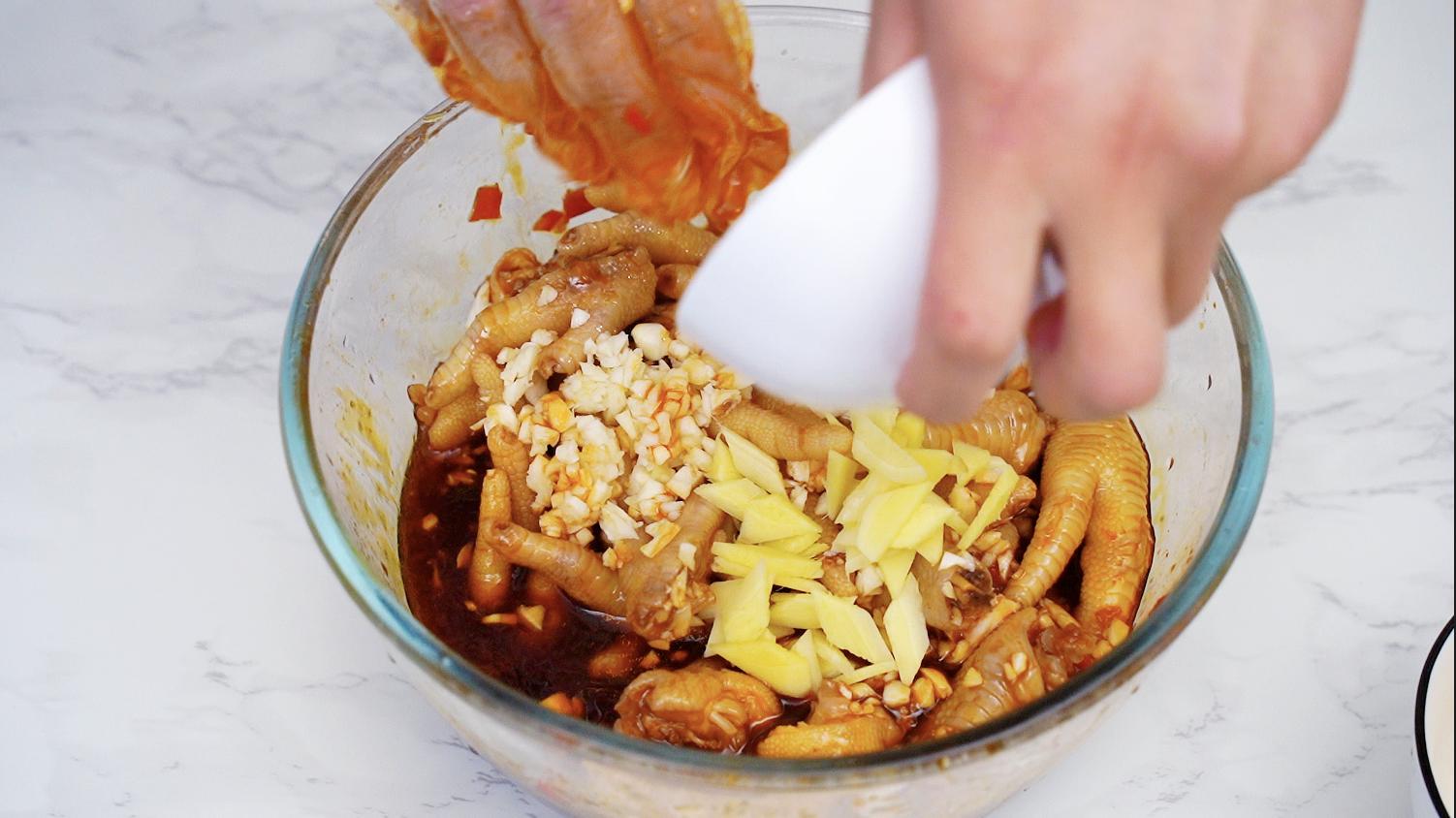 我们把调制好的酱汁倒入我们冰镇好的鸡爪里