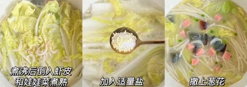 3、煮沸后倒入娃娃菜和虾皮煮熟,加入适量盐,最后撒上葱花出锅即可