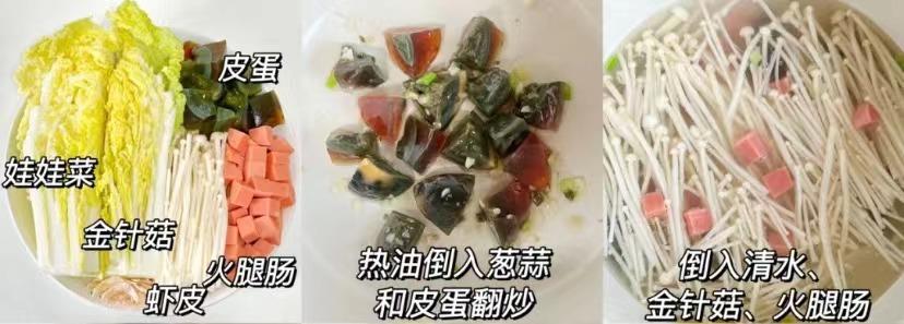 准备:娃娃菜、皮蛋、金针菇、火腿肠、虾皮、葱蒜、调味料