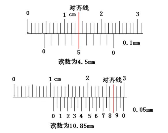 游标卡尺,分别以精度0.1mm、0.05mm为例:第一步:主尺读数到毫米,4mm第二步:找副尺与主尺对其的刻度线,图中第五格与主尺对其,则为5×0.1mm(精度)=0.5mm第三步:主尺和副尺相加,即,4mm+0.5mm=4.5mm精度0.05mm的步骤相同,主尺10mm,副尺17×0.05mm=0.85mm,总长10.85mm。