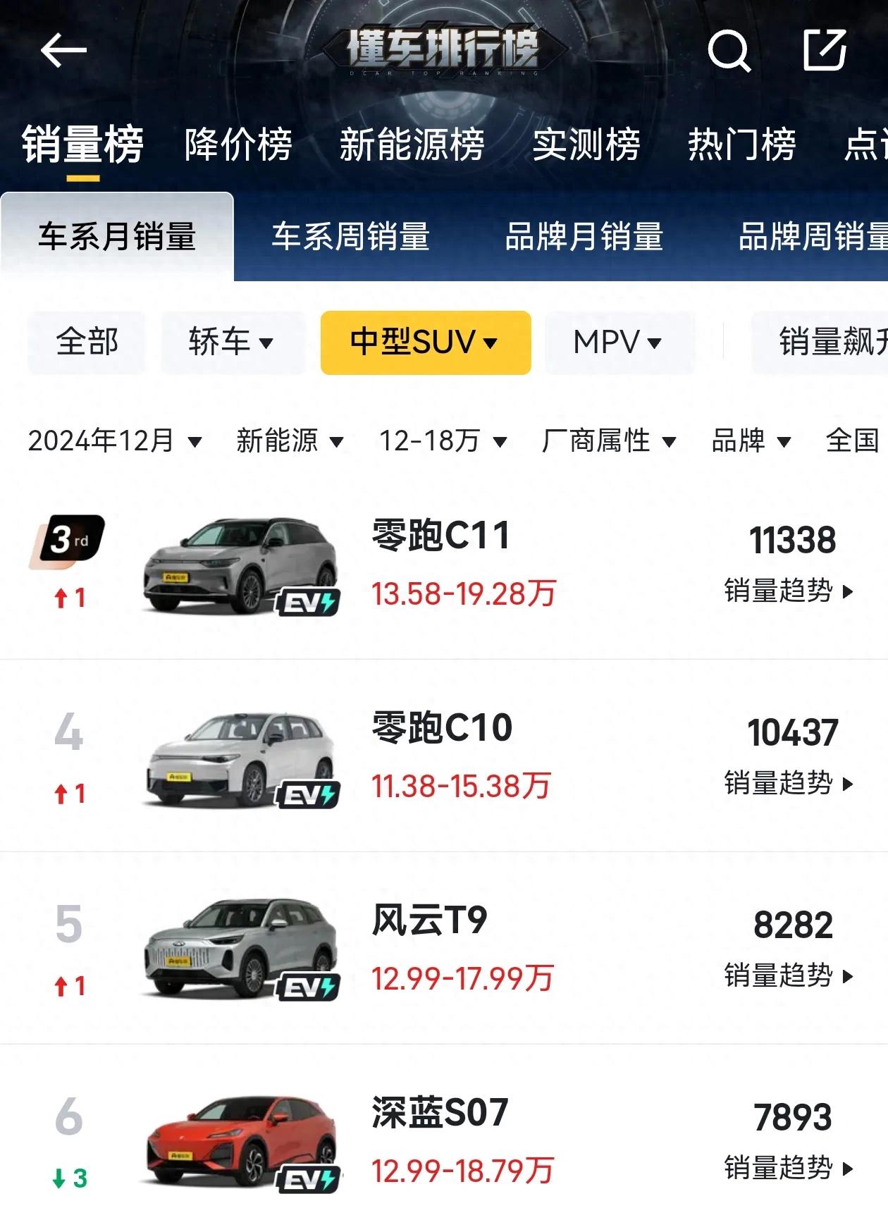 在24年12月的12~18万级新能源中型SUV销量排行榜上,零跑C11排名第三,超过了同价位的竞品深蓝S07。