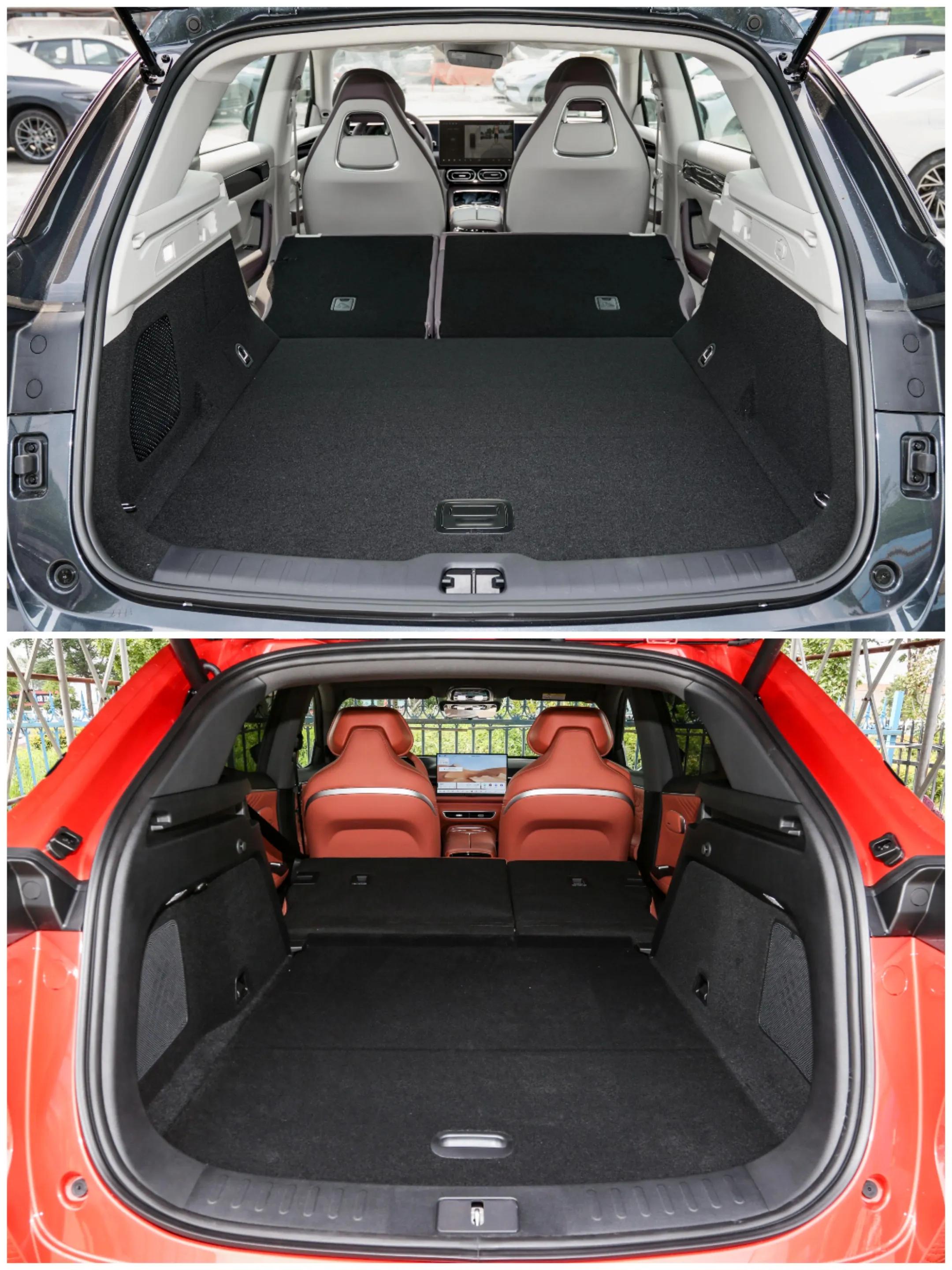 两款车的后排座椅均支持4/6比例放倒,不过好玩的一点是,零跑C11的后备箱常规容积仅为375L,最大也只能拓展至840L;深蓝S07的后备箱常规容积为445L,最大可拓展至1385L。零跑C11在后备箱两侧贴心地设计了挂钩,方便挂购物袋等物品,防止倾倒。