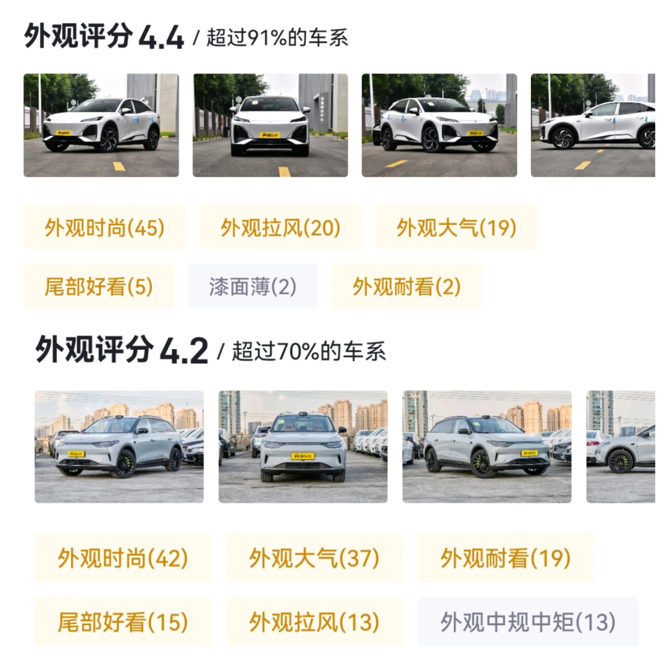 首先在车身外观方面,两款车都获得了车主大量的正面评价,这也好理解:如果消费者对车辆的外观造型都不满意,最后也很难会选择这款产品的。