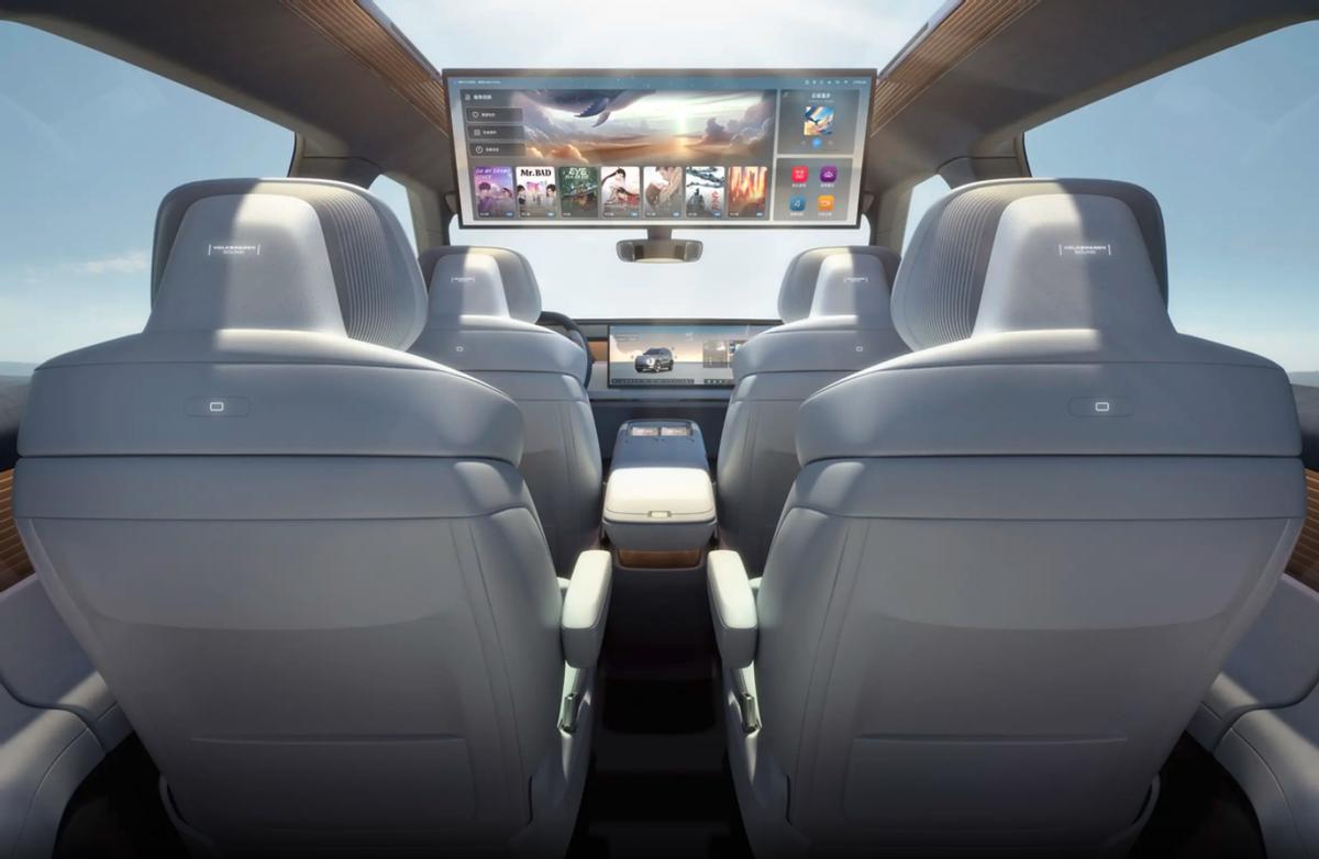 内饰方面的话,车展上的大众ID.ERA概念车是没法开门的一个状态,不过我们可以透过车窗隐约的看到一些设计理念,基本上与此前曝光的官图大差不差,所以我们就以大众ID.ERA的官图为例。从图中可以看到,大众ID.ERA的前排同样是给到了一块大联屏,与领克900的前排有几分相似。而除了这些之外,大众ID.ERA的仪表盘,以及车门板两侧的显示屏都采用了数字屏幕显示的风格,从而进一步的提升车内的现代科技感。