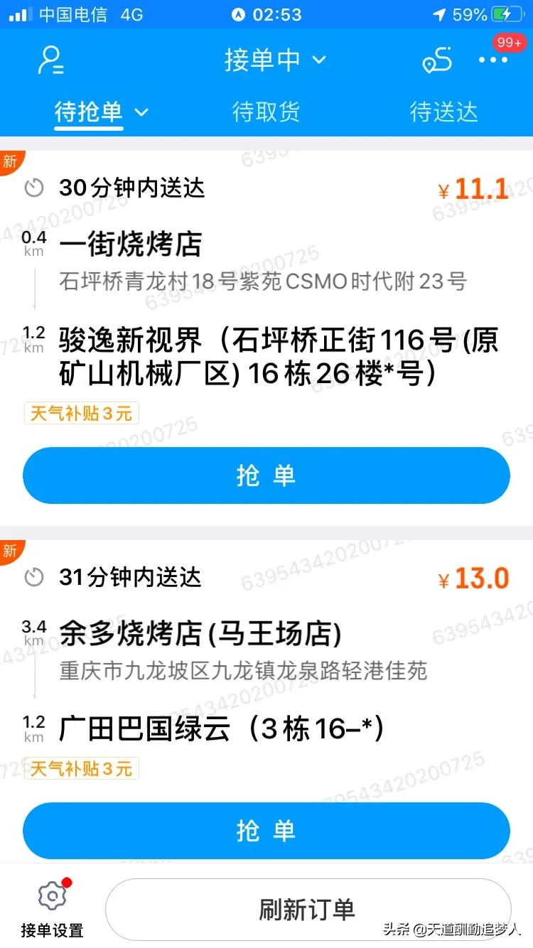 新手最适合跑哪个平台?如果是对周围路径完全不熟悉路痴,建议先跑蜂鸟众包,因为时间稍微长点利于寻找路,被差评也不会扣钱。等到完全熟悉路径后,建议可以两个平台一起跑,只要同一方向时间估计来得及,两个平台的单都可以接单,这样可以多跑点单增加收入,我就是两个平台一起跑。我在天晴的时候,骑电动摩托车一天跑11小时左右,可以跑160块钱到200块钱左右,下雨天有天气补贴要跑得多点。