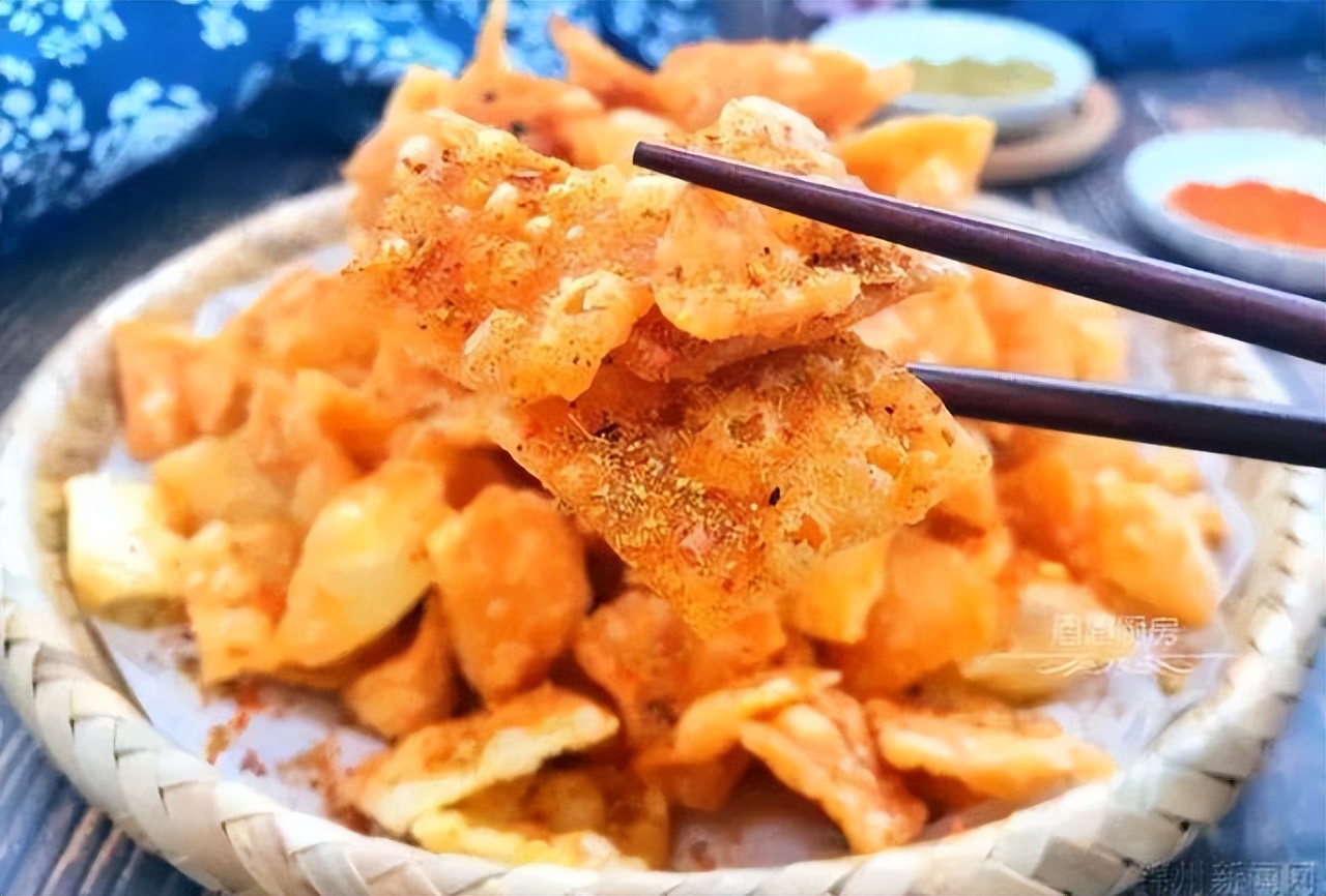 第十八种吃法:油炸饺子皮,饺子皮切几刀,裹上一层蛋液,放入油锅炸至起鼓起酥脆,出锅装盘,撒料即可。