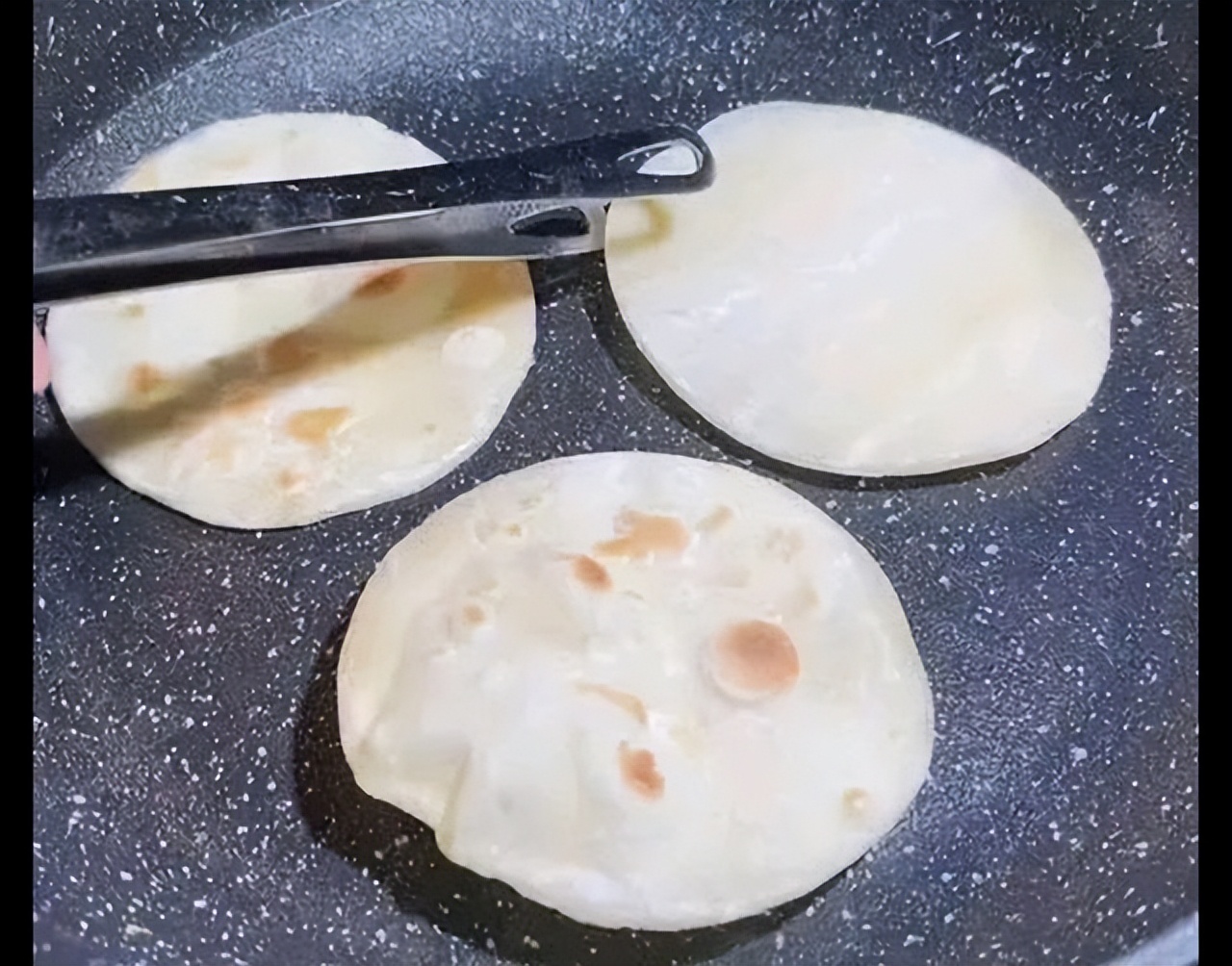 第十四种吃法:懒人小饼,锅烧热,刷薄油,将饺子皮放入锅中,饼鼓起来翻至另外一面,即熟。