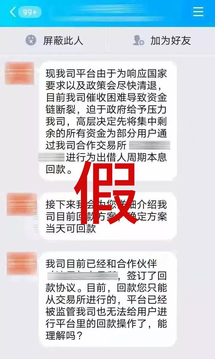 近期,一些犯罪分子冒充非法集资、暴雷的P2P等平台的客服,以回款、清退的名义,要求受害人缴纳税费、解冻资金,以进行诈骗。