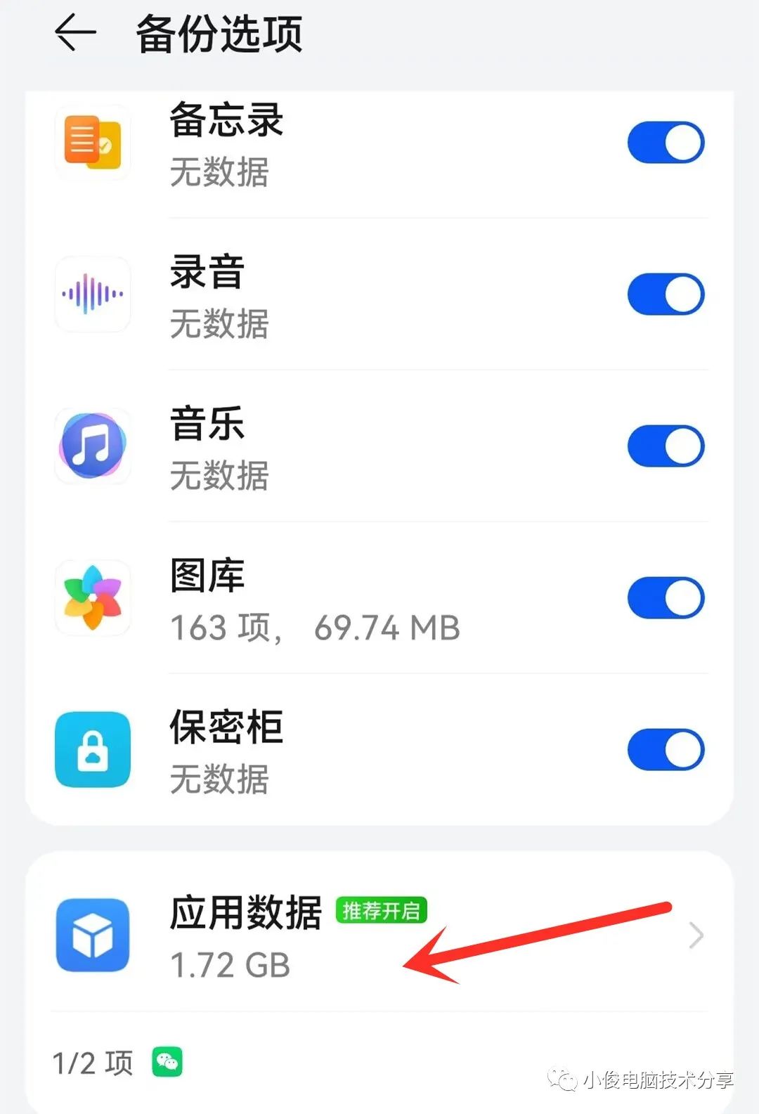 在备份选项中,我们选择应用数据,然后就可以选择需要备份的应用数据,在这里我们选择微信,接着在备份的时候,就可以把微信聊天记录,接收的文件一起备份起来了!
