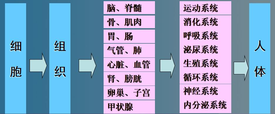 传统的人体构成要素是从细胞到组织到器官再到系统,最后形成一个统一的有机体即人体。
