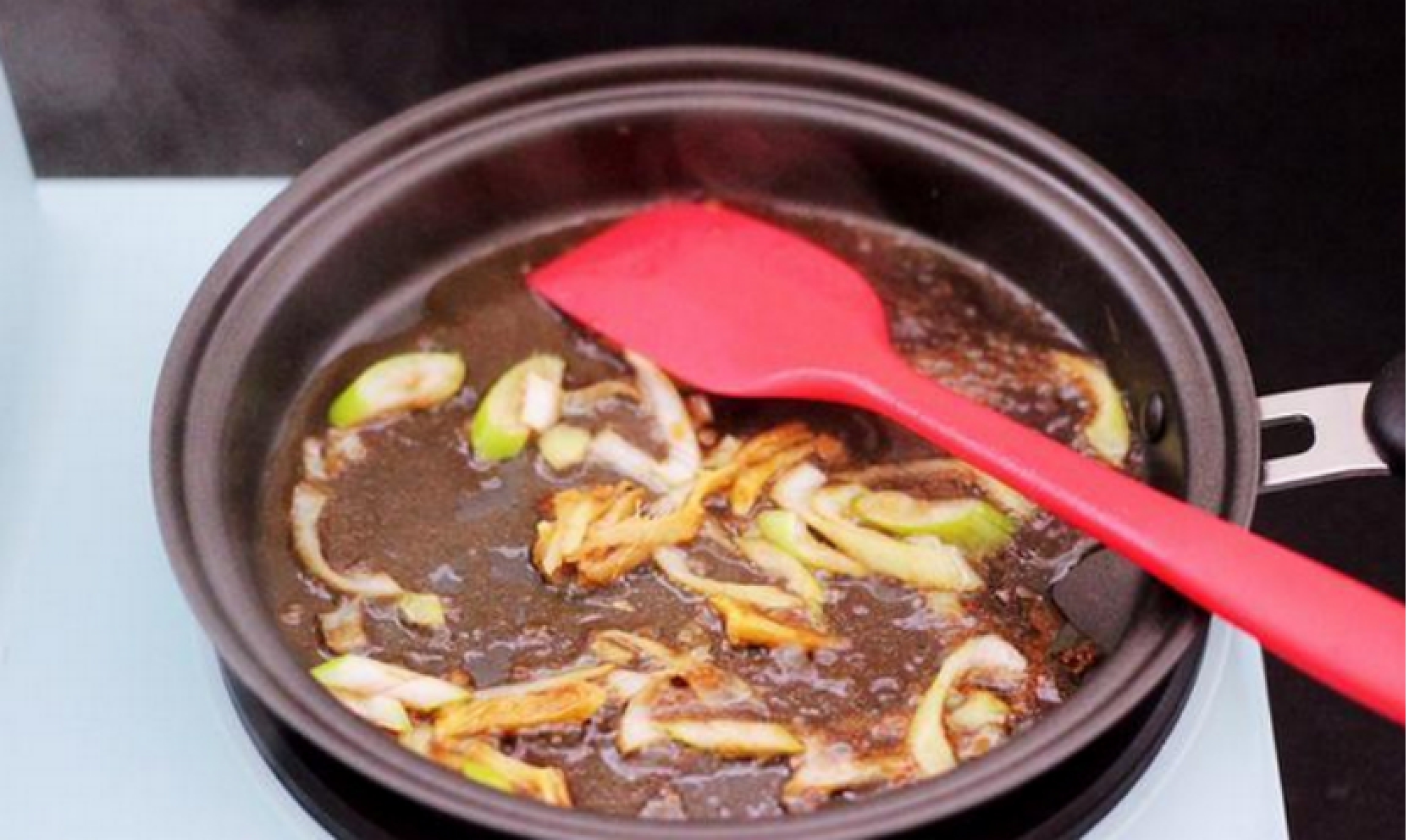 第二步:拿一口平底锅出来在拆开方便面包装后,把调料包中的那个油包拆了全部倒进平底锅里面开火加热一下,然后把葱姜丝给放进去照样还是要爆出香味。把我们煮好的肉汤倒进锅里面,把肉汤用大火烧开之后就可以关火了。