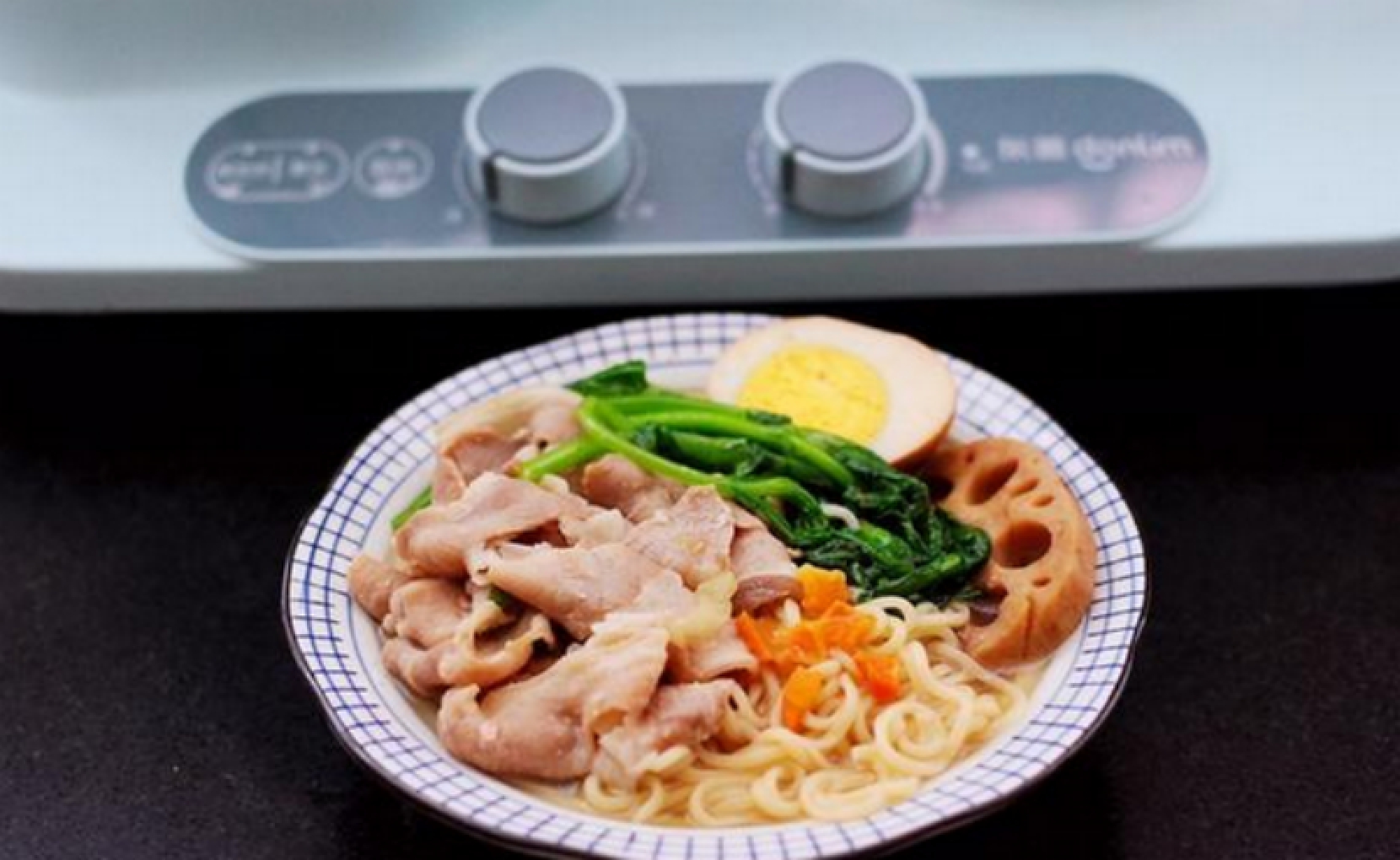 第六步:卤蛋和卤藕放进去稍微加热一下之后就可以关火了,把锅里的面条和汤汁全部倒进一个大碗里面,然后把羊肉卷放在面条上面,这样这个方便面就可以开动啦。