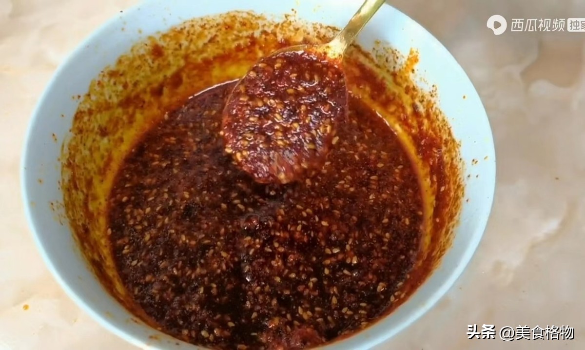 之后烧一些热油,直接泼入碗中,将辣椒粉激发出香味,用小勺子稍稍搅拌一下,让油和辣椒粉、白芝麻充分的混合均匀。