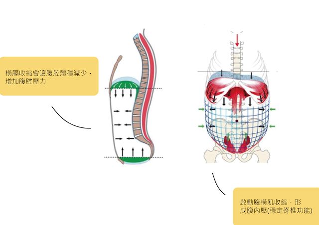 人体在动作时,首先横膈肌会先于腹部肌群先启动,若是横膈膜无力,亦会造成腹部肌肉活化不平衡,使深层核心肌群,如腹内斜肌、腹横肌,肌张力减少;肌肉无力,便无法产生足够的腹内压去稳定支持脊椎,特别是在胸腰交界处(TL junction)、腰椎以及骨盆最易产生影响。