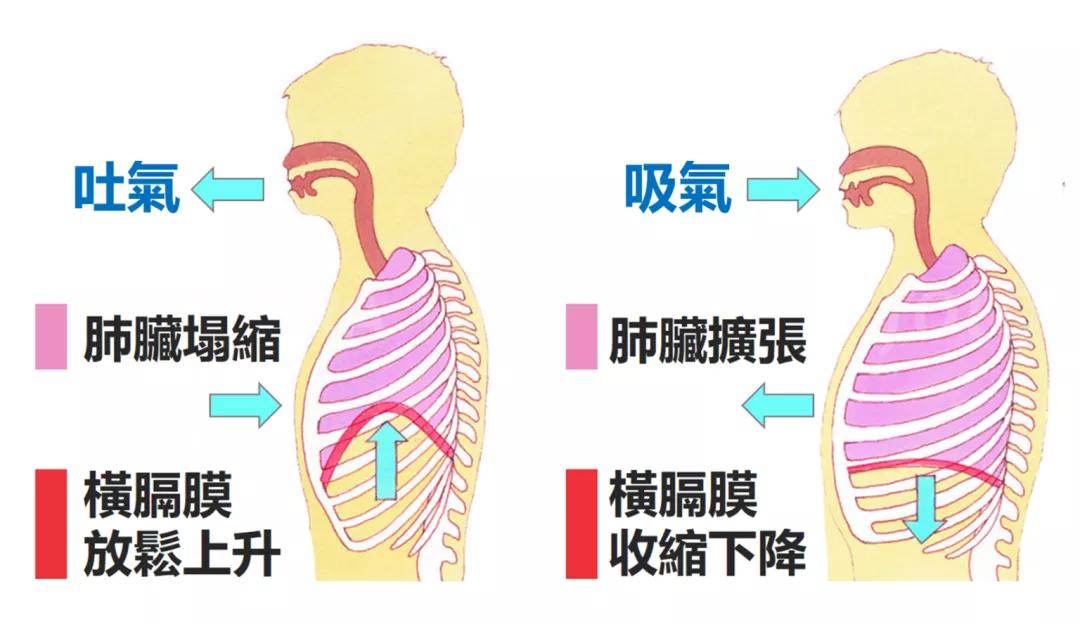 正常的呼吸都得依靠横膈膜,几乎整个呼吸过程都由横膈膜主导。吸气时,横膈膜收缩往下,有如活塞进入腹腔内。造成胸腔负压,让空气进入肺,也同时增加了腹内压。