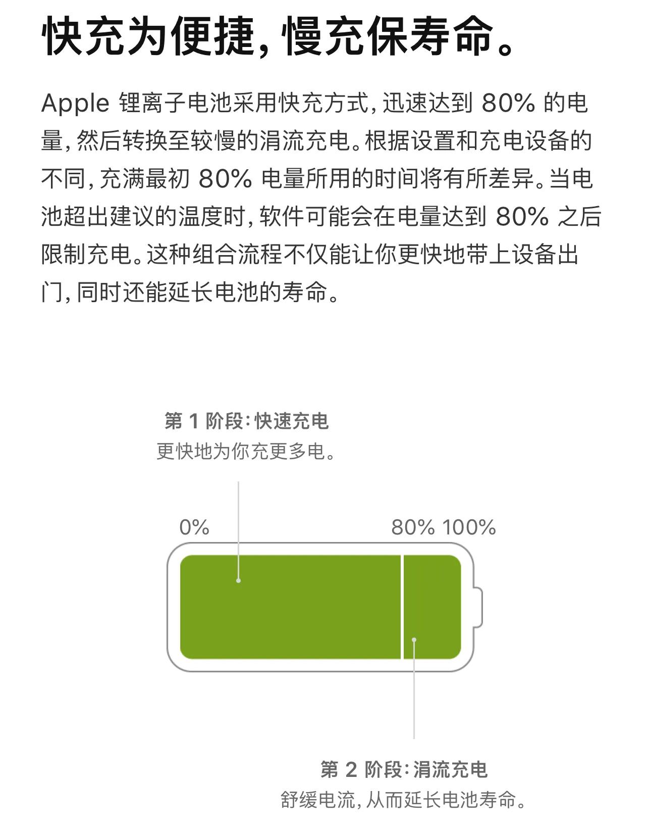 Apple 锂离子电池采用快充方式,迅速达到80%的电量,然后转换至较慢的涓流充电。根据设置和充电设备的不同,充满开始 80% 电量所用的时间将有所差异。当电池超出建议的温度时,软件可能会在电量达到80%之后限制充电。这种组合流程不仅能让你更快地带上设备出门,同时还能延长电池的寿命。