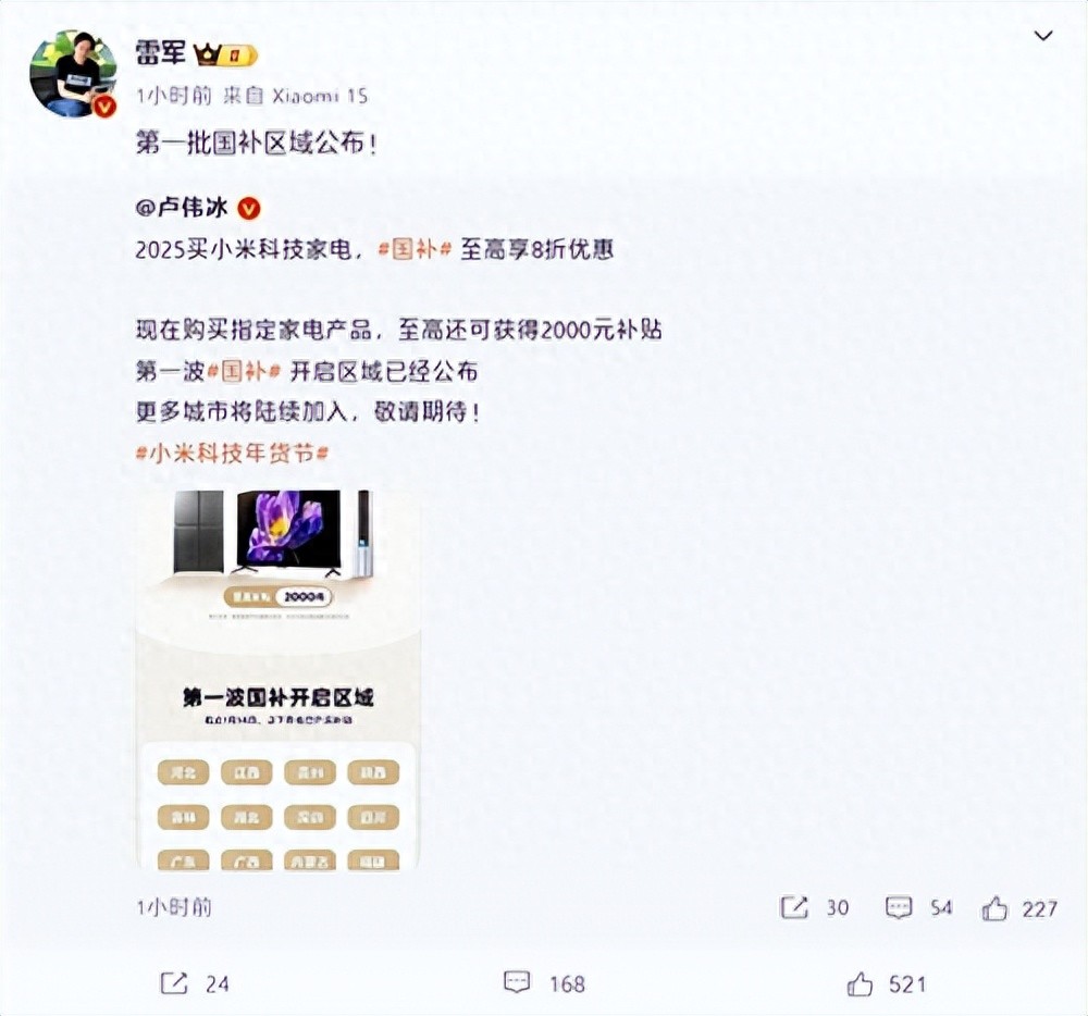 1月16日消息,今天,雷军、卢伟冰陆续发文宣布,2025年小米国补已经正式上线。