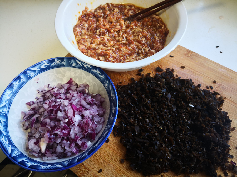 3.取一把木耳用温水泡发好后,再下锅焯水1分钟,然后捞出过凉水,接着控干水分后放到案板上剁细备用;一半洋葱用刀切碎剁细备用。