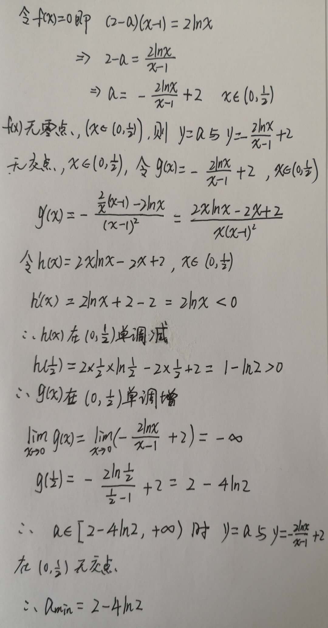 接下来,我们用分参的方法,首先令函数为零,将参数 a 分离到等式的左边,其余部分划到等式的右边,将右边看作一个新的函数。对新函数求导后发现,并不能很容易看出导数的正负值,然后对导数的分子部分进一步求导(因为分母恒大于零),发现导数小于零,故而分子函数在区间上单调减,将右端点(最小值)代入后发现其大于零,说明分子在区间上恒大于零,即新函数的导数在区间上恒大于零,新函数在区间上单调递增,通过端点我们就能计算出新函数的取值范围,进而确定 a 的范围,使得方程在区间上无解(题目要求)。