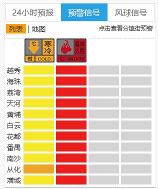 广东北部大部分市县寒冷橙色、黄色预警已然生效,广州各区截至18时22分,寒冷橙色、黄色预警已生效。