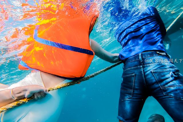 现实大概是,我们都没有和这些魔鬼鱼打交道的经验,肯定不能像他说的一样真的气在鱼身上,但是船长确实留了根很长的绳子给我们,船员泡在海里带着我们找魔鬼鱼。真的是可以直接看到魔鬼鱼,不再是隔着玻璃去看,只不过他们在下面我们在上面,只有它们偶尔翻转把肚子那一面漏出来的时候我们才能看到他的笑脸。尽管我们没有能真如那人所言去和魔鬼鱼玩耍,但被船拖了一路的我们也真的是在和魔鬼鱼玩耍了。