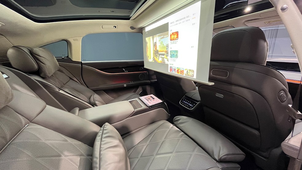 其次是新增了四分之一悬停模式,可以用来显示时间、歌词等;还增加了后门开车预警模式,如果检测到有危险,会在投影上显现,提醒后排乘客。激光巨幕投影凭借高亮度、高分辨率特性,为车内乘客打造了私人影院般的视听享受。