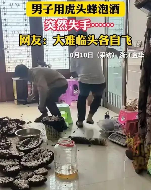 10月10日下午,浙江某地。两个男子正准备把金环虎头蜂倒进酒瓶里泡酒。可能是手滑还是怎么的,瓶子一翻,蜂群哗啦啦全飞出来了!这下可把两人吓坏了。