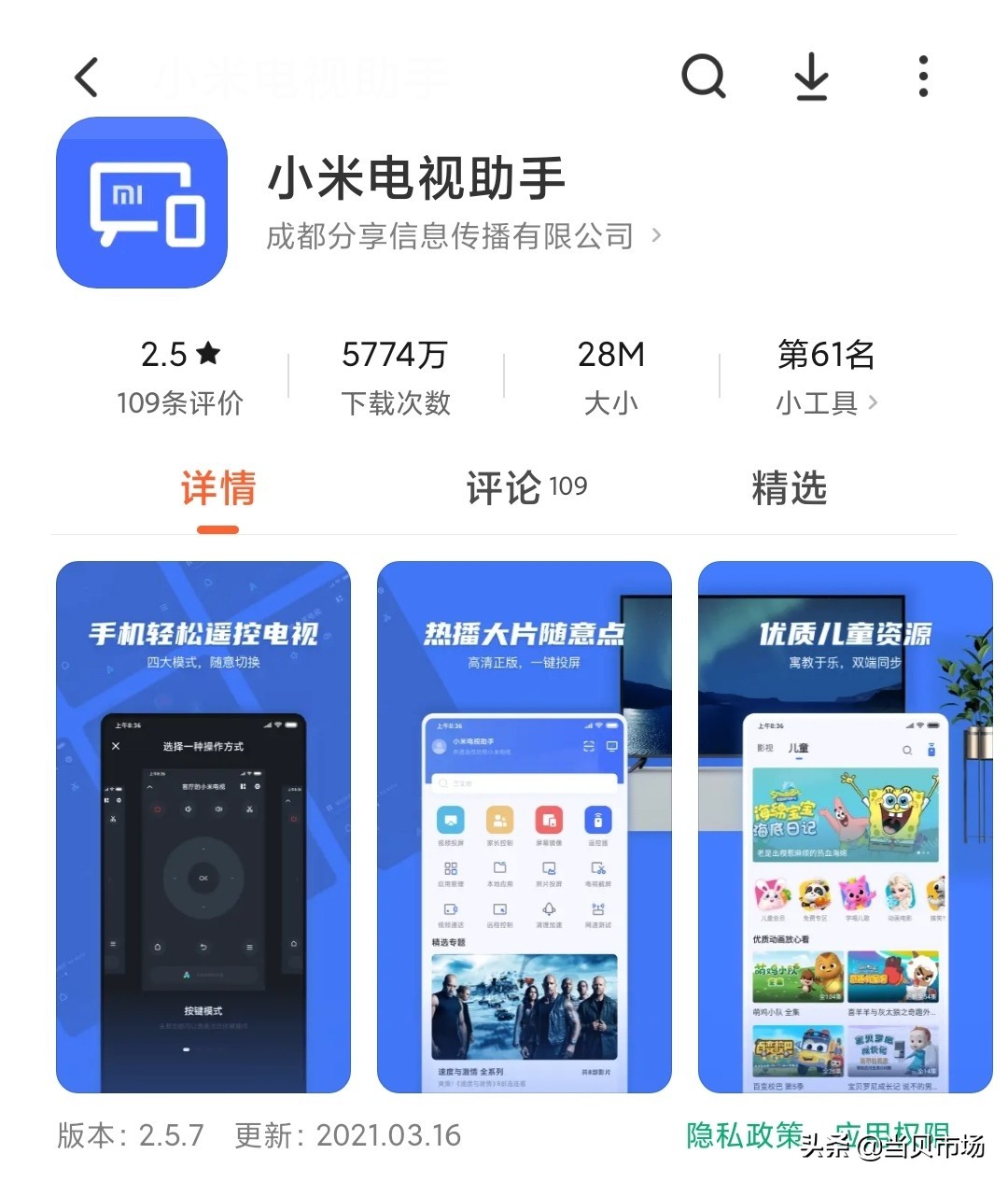 在手机自带的应用商店里安装【小米电视助手】。自带应用商店里没有的,可以直接在百度上搜索下载一个。
