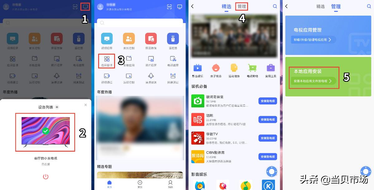 保持手机和电视同一WiFi,在小米电视助手的右上角连接家里的电视。连接上电视后,点击【应用管理】-选择【管理】标签页-选择【本地应用安装】