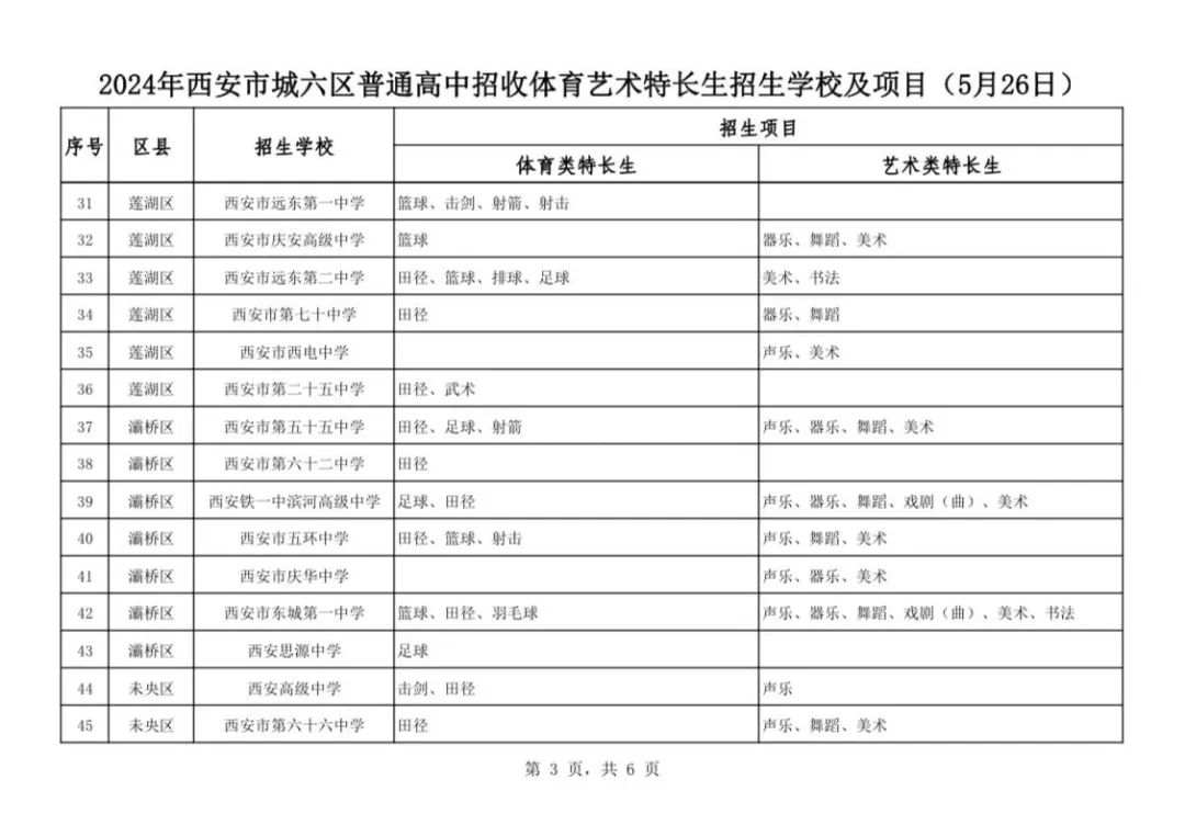 5月28日,西安市教育局官网发布《2024年西安市城六区普通高中招收体育艺术特长生招生学校及项目公告》。