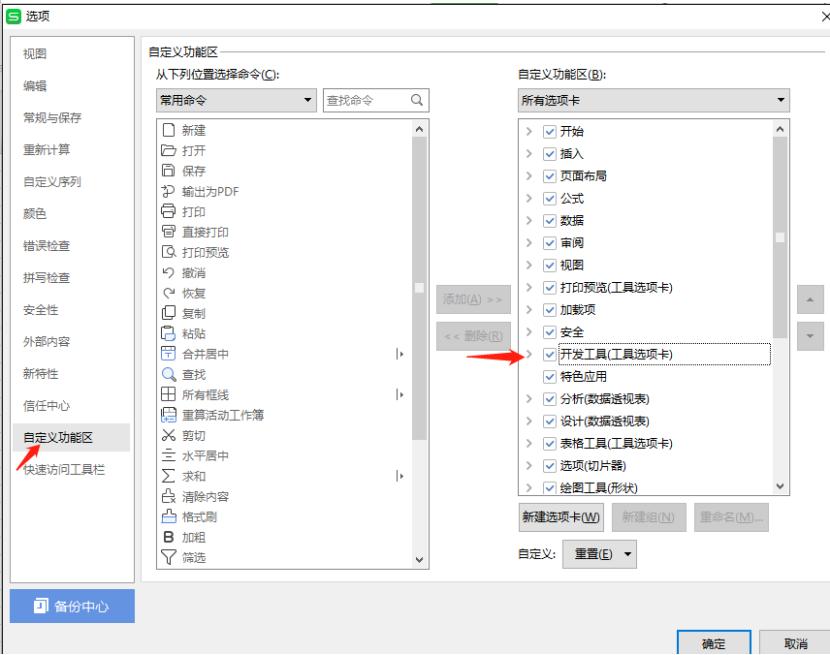 之后弹出如下对话框,我们选择【自定义功能区】,然后选中右侧的【开发工具】,这样工具栏就会显示开发工具,如下图所示: