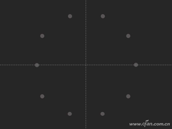 接下来想办法将这十个点均匀地分布在同一个圆周上。小编使用的方法,是通过辅助线及PowerPoint的对齐功能来完成。首先右击幻灯片,选择“网格和参考线→添加水平参考线”,同样方法再添加垂直参考线。接着再绘一个正方形,与十字线中心对齐。接下来通过对齐功能将10个点均匀地排布在正方形上。最后,删除辅助用的正方形,再将对角的圆点调好位置,一个10秒的时钟点就完成了。
