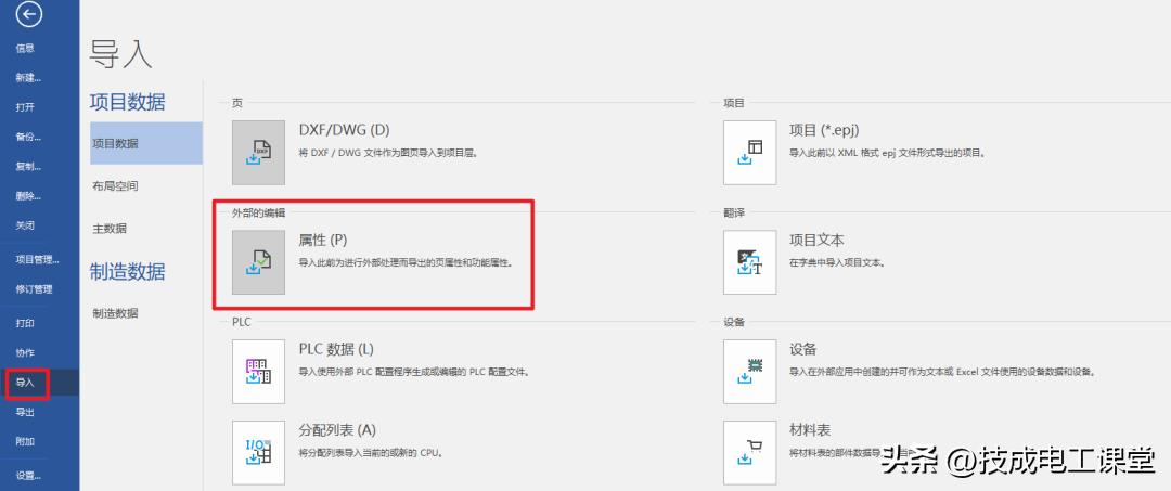 3. 执行导入:选中当前项目,打开后台视图,点击文件→导入→外部的编辑→属性,如下图所示。