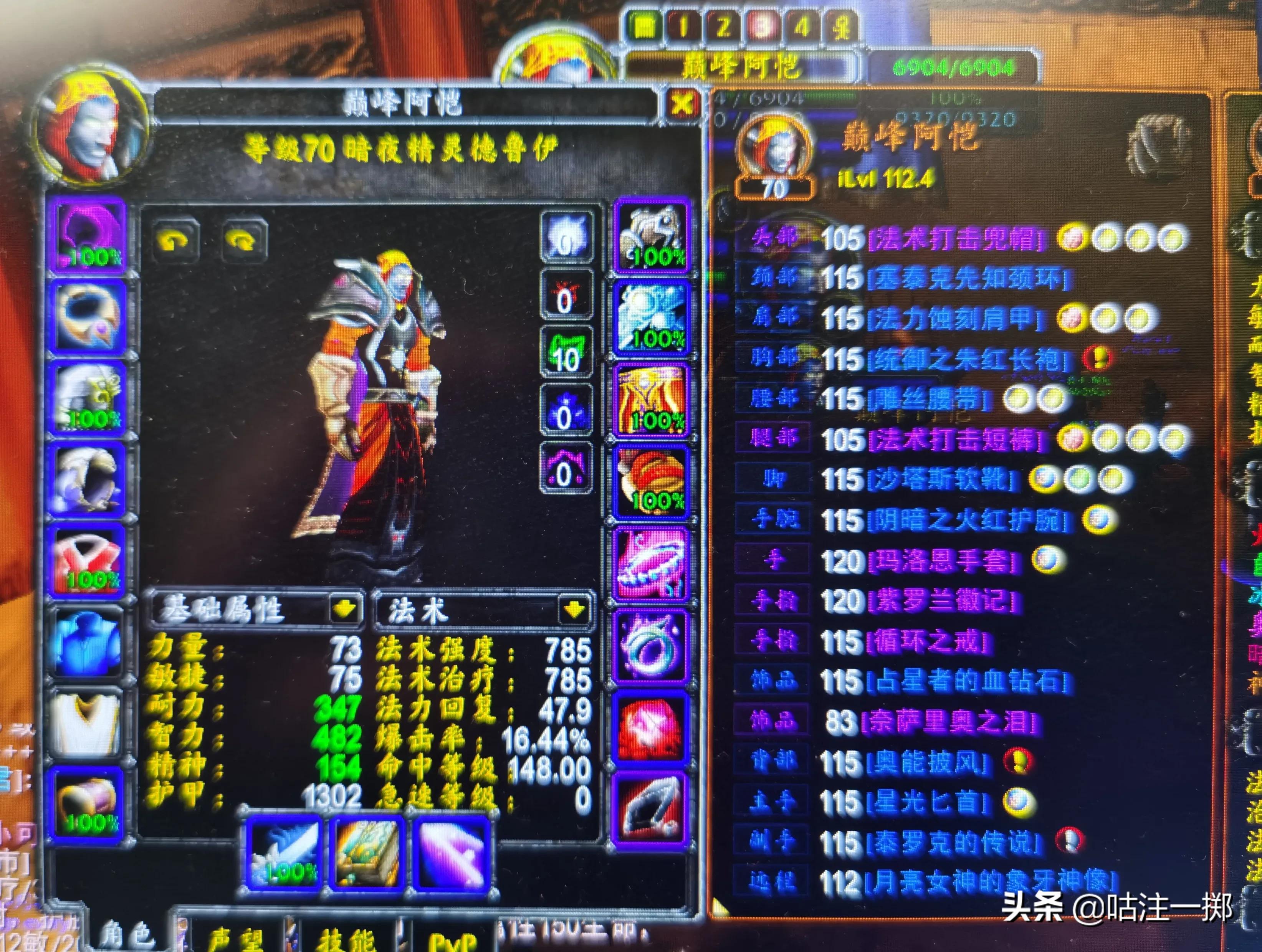目前作者的装备为2+3,几乎没有什么团本装备(是我ROLL不到),面板满命中152命中等级,法伤900+,智力463,身上几乎全是8智力宝石,这样才能更好的利用月神指引天赋和梦境天赋以及魔焰三件套效果:提升法伤,数值等于你智力总值的7%。配装的思路就是满足命中往152堆,但不能超过,剩下堆法伤。作者目前这套配装进入团本中满BUFF情况下有接近11000的蓝量。