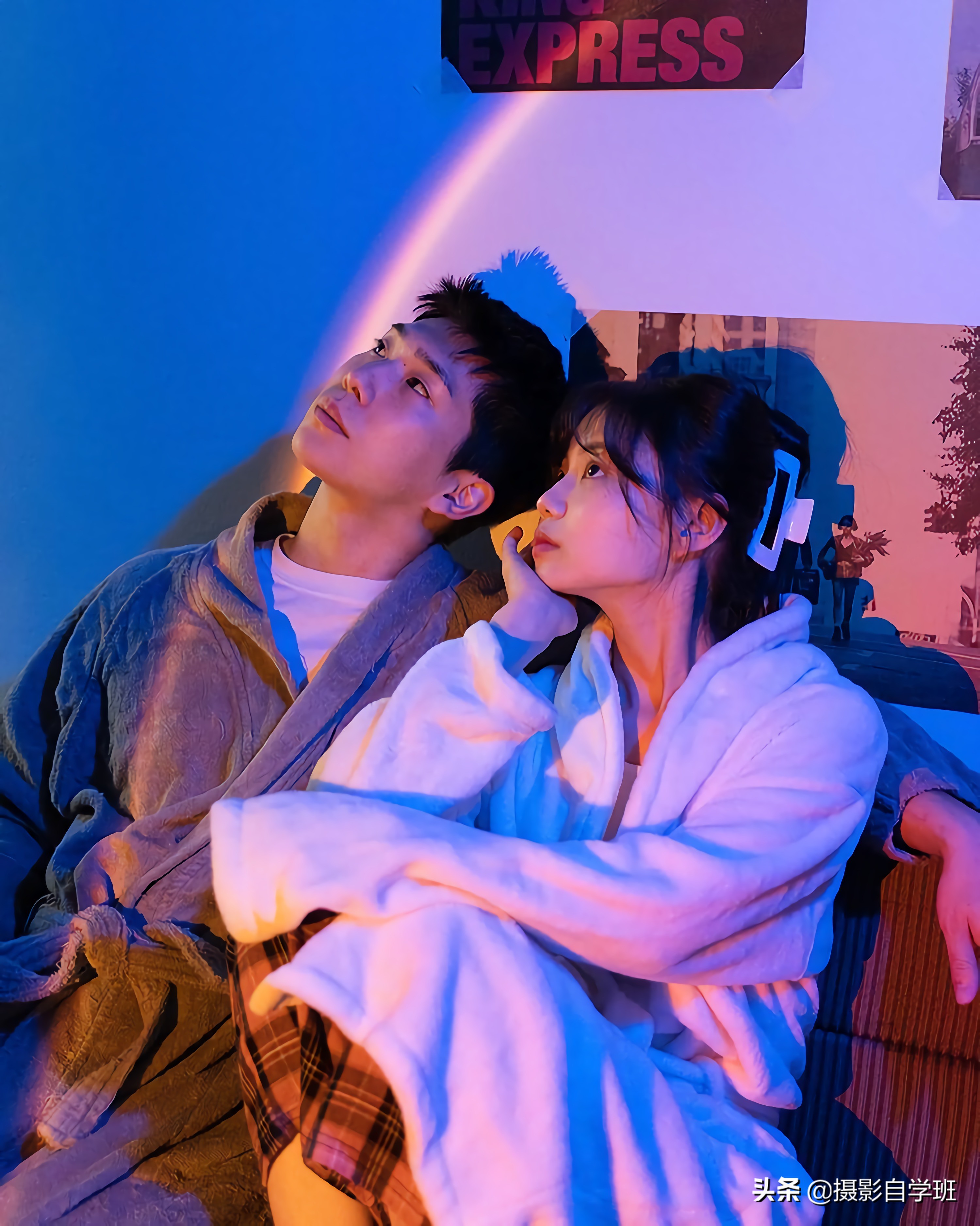 可以用家中的投影,或者电视,或者手电,等等任何能发光的物体,打出上图或者下图这样的光线,两个人的姿势可以像上图这样,都靠在沙发上,抬头看棚顶,或者像下图,这样一个人看向,下面另外一个人看向墙面。有好看的姿势,更要有漂亮的光线照片才会更美观。