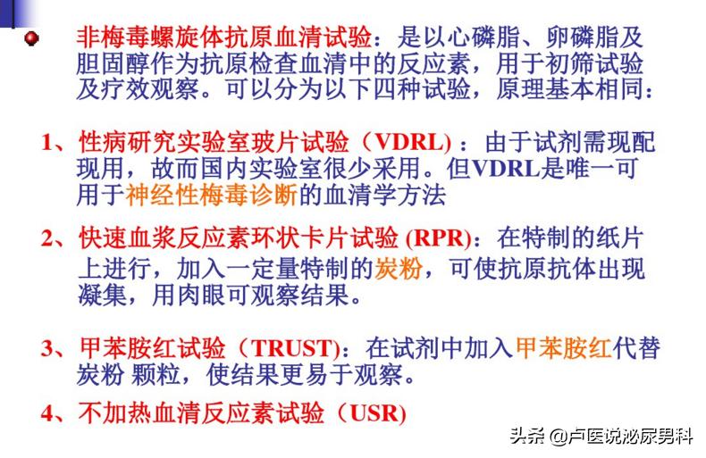 实际上,梅毒是由一种叫做“梅毒螺旋体”引起的性传播疾病,这种病原体是人类所特有的,人类对梅毒没有先天免疫性,尚无疫苗接种进行人工免疫,仅能在受感染后产生感染性免疫。已经完全治愈的早期梅毒患者仍可以再感染。人体感染梅毒后,会产生igM抗体、igG抗体和反应素(本质也是一种抗体类型),而“梅毒TPPA检测”和“梅毒TRUST半定量检测”正是利用了人体感染梅毒后,能够产生抗体和反应素的原理,进行的诊断性检测。