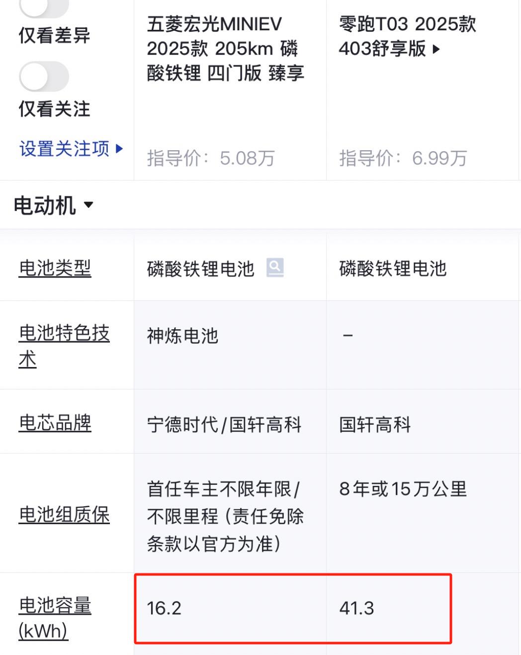 零跑新T03搭载了41.3kWh的磷酸铁锂电池,电续航里程为403km,宏光MINIEV搭载了16.2kWh的磷酸铁锂电池,电续航里程为205km