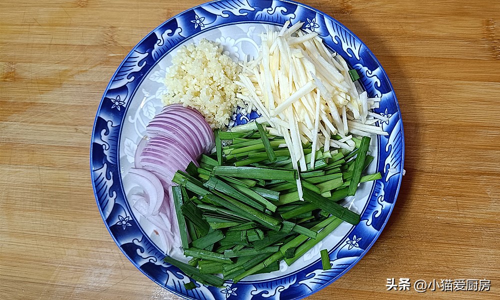 【步骤七】:把洋葱切成丝、大蒜拍碎切成蒜末、苹果切成丝、韭菜切成长段,分别装盘备用。
