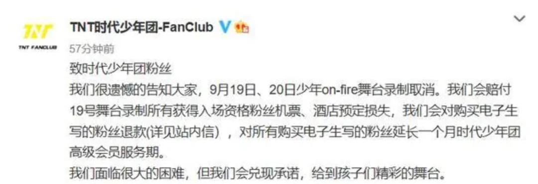 9月11日,时代少年团粉丝俱乐部发文称,原定在19、20日举办的打歌舞台录制取消,同时公司还将赔付粉丝的机票酒店预订损失,以及购买电子写生的钱,还把粉丝高级会员的服务期延长一个月。