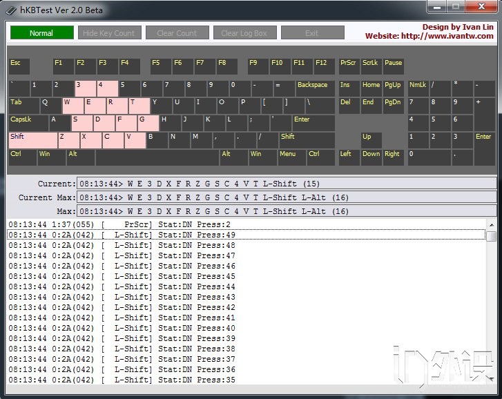 需要注意的是雷蛇黑寡妇X幻彩版机械键盘处于普通模式下只有6键无冲,而切换至游戏模式下,标称能够10键无冲,但实测实际能够实现最大16键无冲。