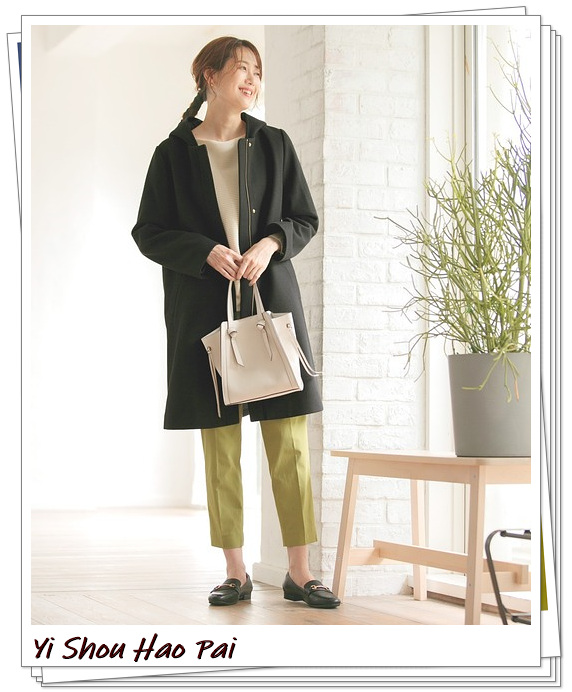 小脚裤,修身设计,九分的长度让脚踝露出来了,带来了轻松休闲感。绿黄色是与黑色搭配得很好的一种颜色,因此会让造型显得会更加生动。米色的针织衫和手袋给人一种女性化的感觉。将其与连帽大衣结合,可获得优雅的外观。脚上有乐福鞋,增添经典气息。